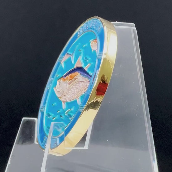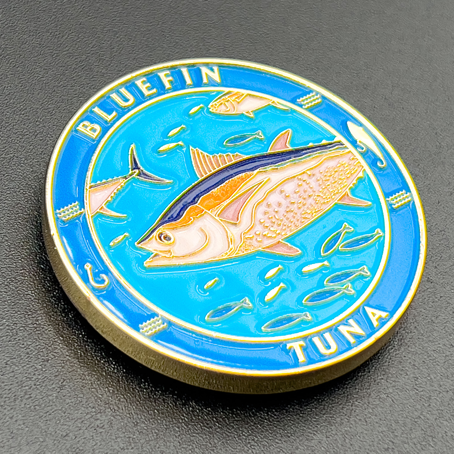 This coin features a school of Bluefin Tuna as they cruise the open ocean mowing down bait. The image is flanked by a circle hook and a trolling lure (A nomadic angry mackerel :) lol!
