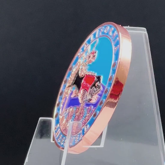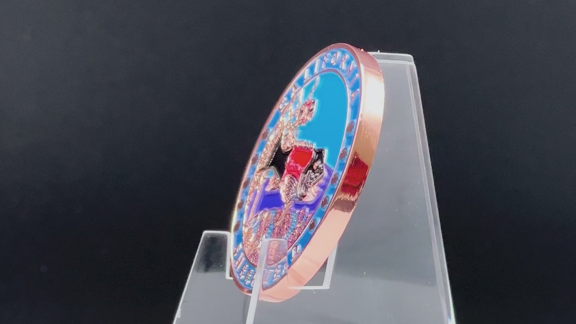 Dimensions: 1.75" Diameter, 4mm thick, plated, enamel coin.