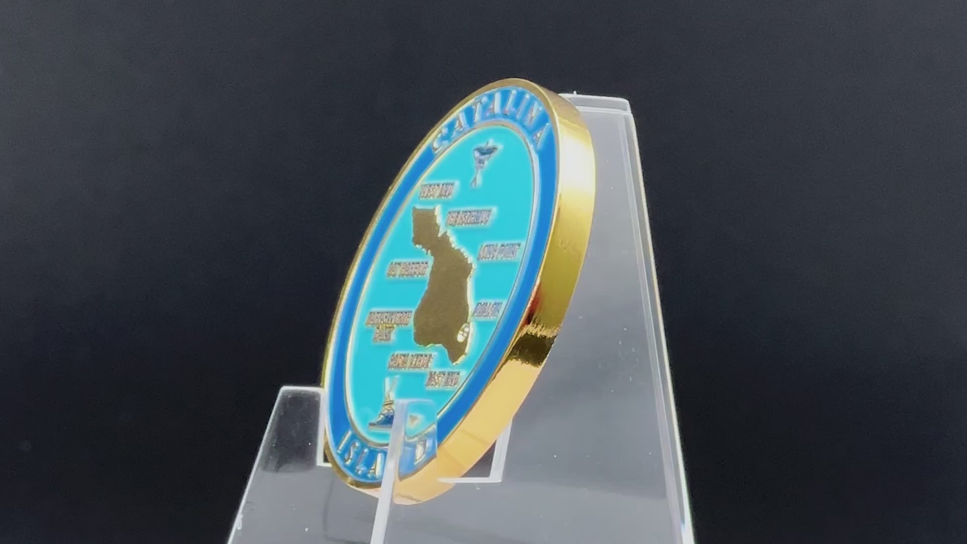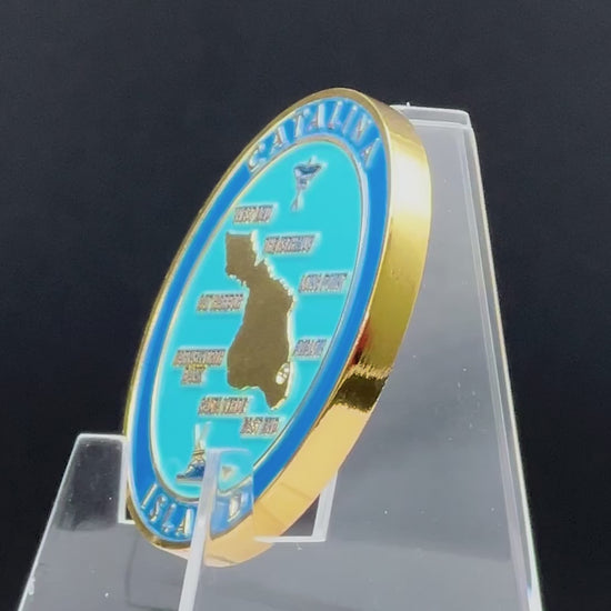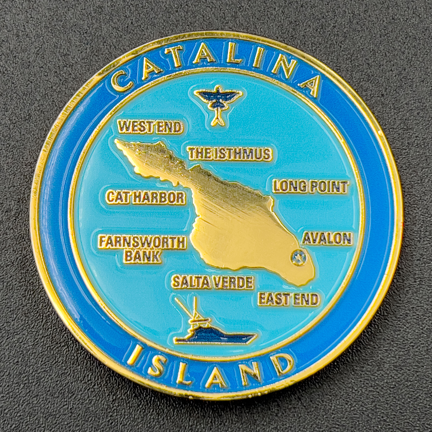 This coin features an aerial view of Catalina Island along with the key points of interest. Additionally the a flying fish and bill fisher are shown on either side of the island.