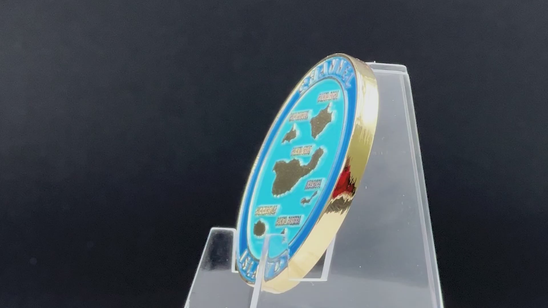 Dimensions: 1.75" Diameter, 4mm thick, plated, enamel coin.