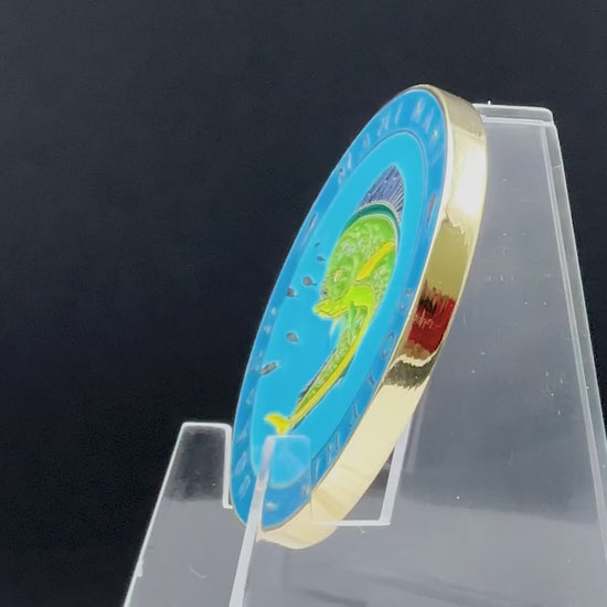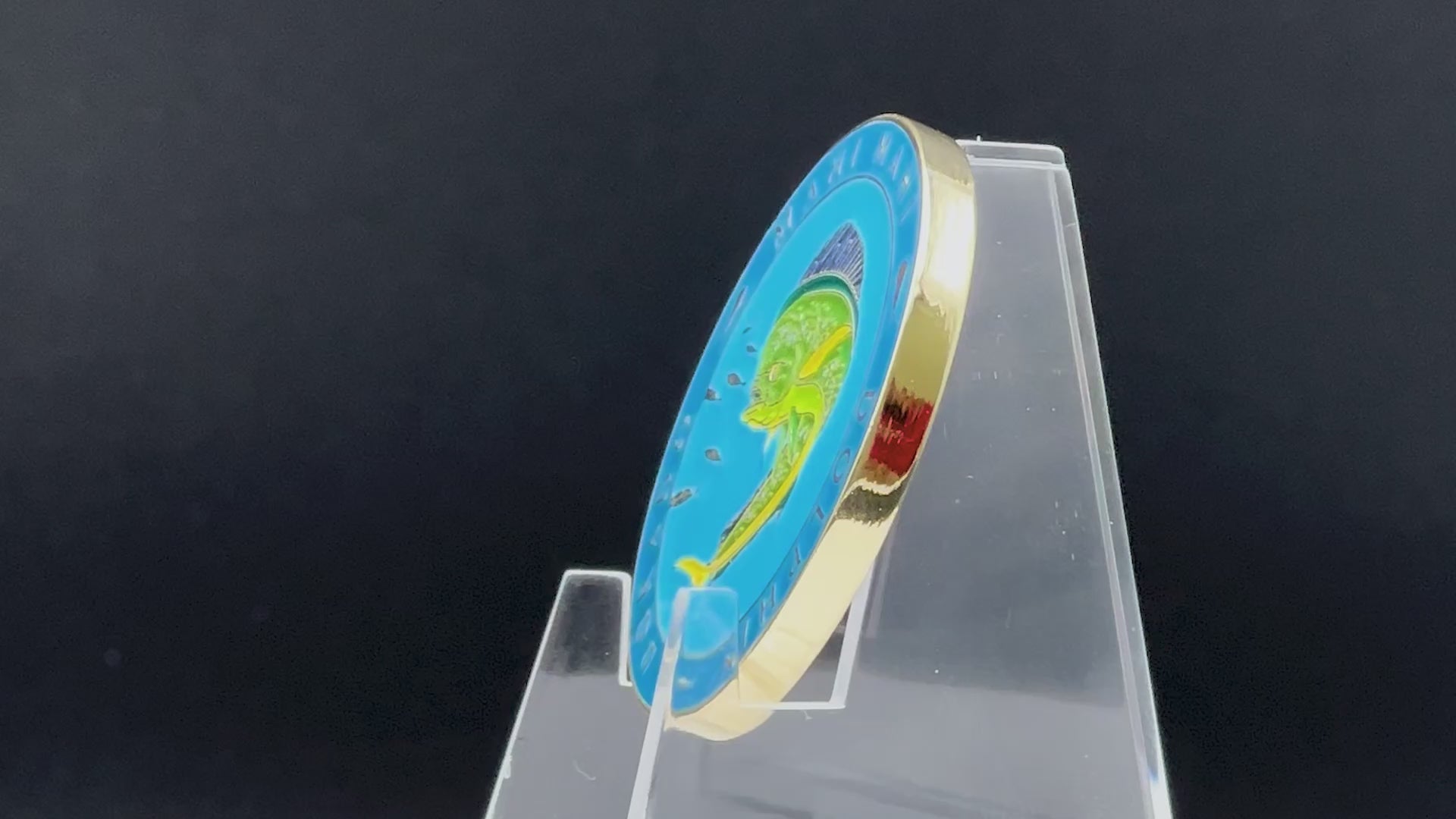 Dimensions: 1.75" Diameter, 4mm thick, plated, enamel coin.