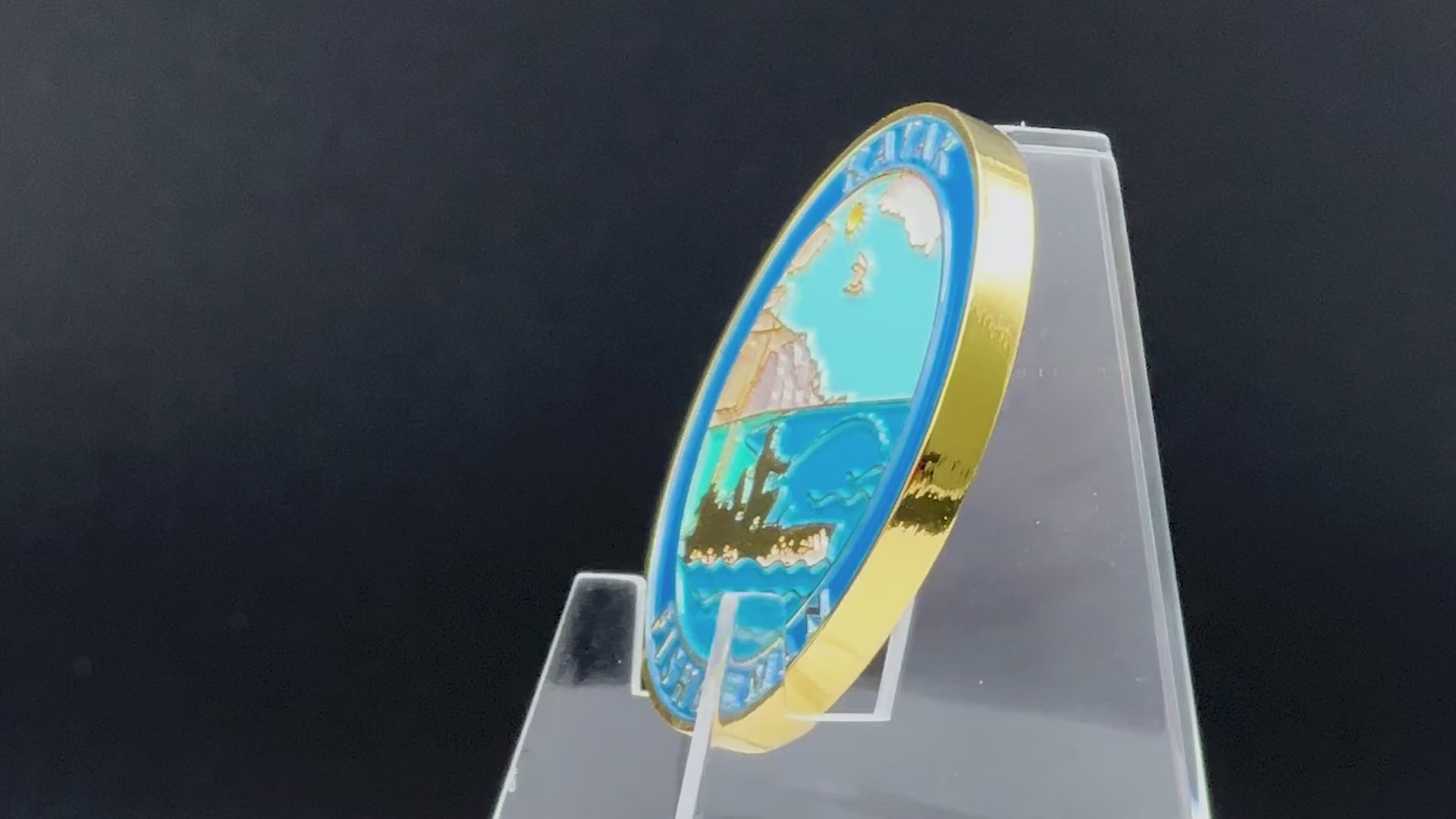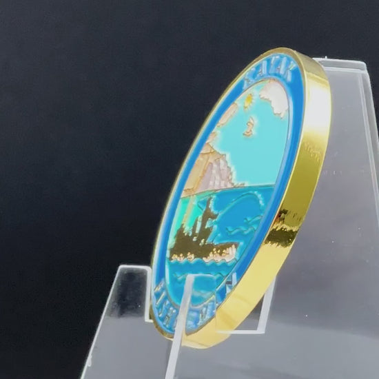 Dimensions: 1.75" Diameter, 4mm thick, plated, enamel coin.