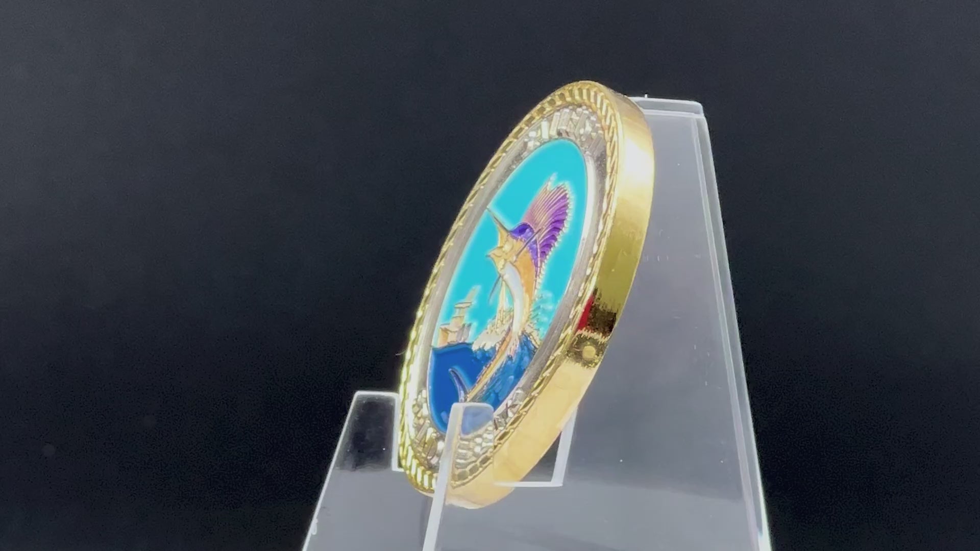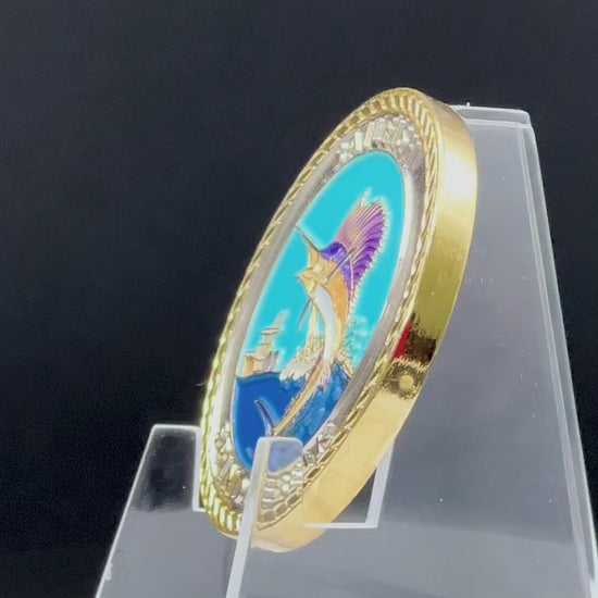 This coin features a Sailfish breeching the surface after being hooked by a sport fishing boat.