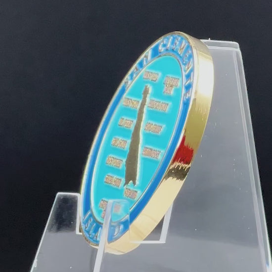 This coin features an aerial view of San Clemente Island off the coast of Southern California. Well known waypoints are marked.