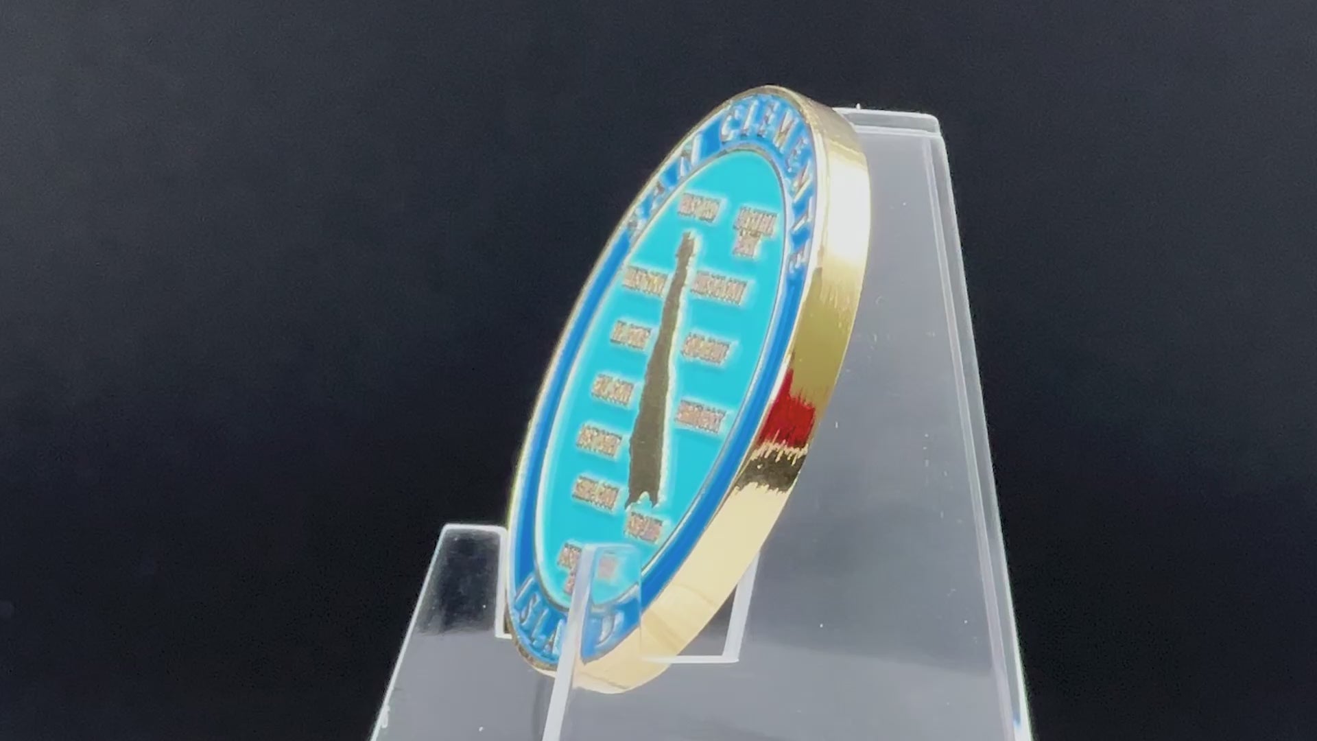 Dimensions: 1.75" Diameter, 4mm thick, plated, enamel coin.