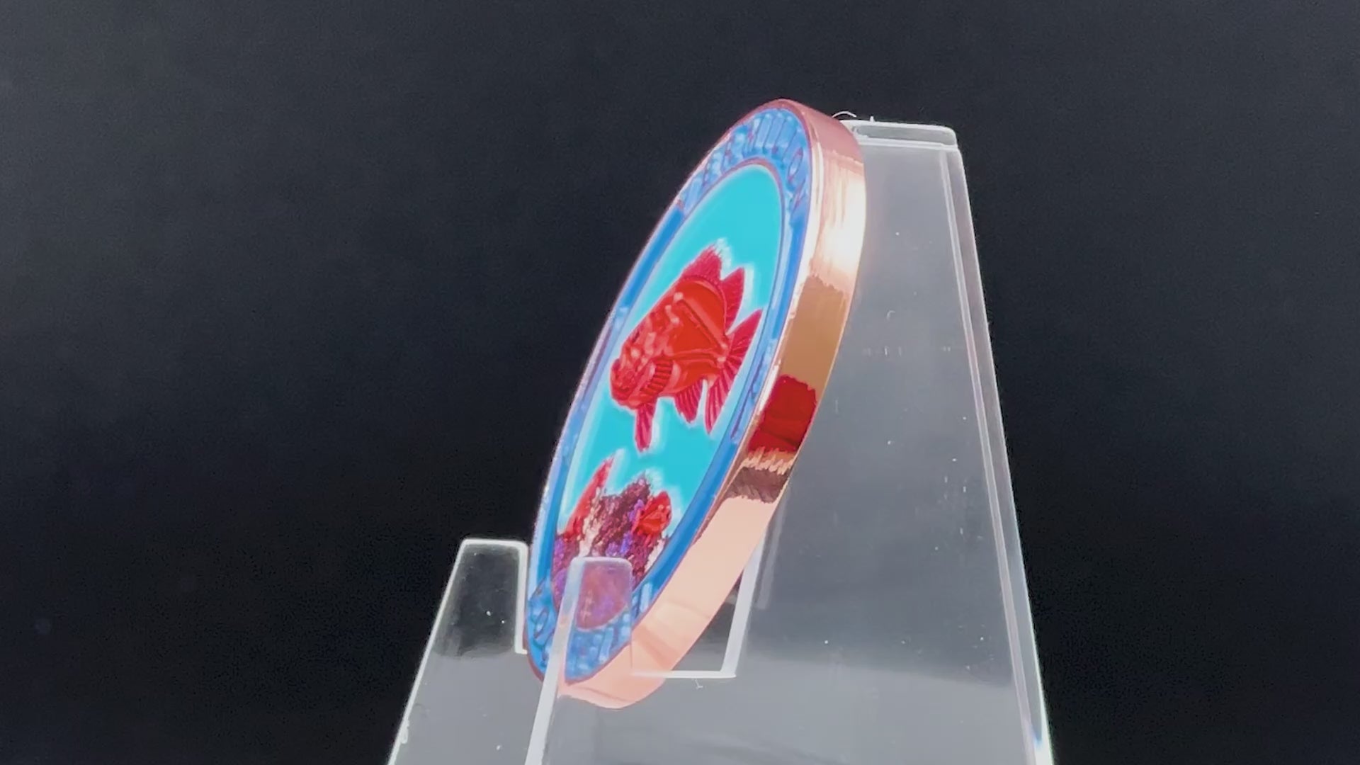 Dimensions: 1.75" Diameter, 4mm thick, plated, enamel coin.