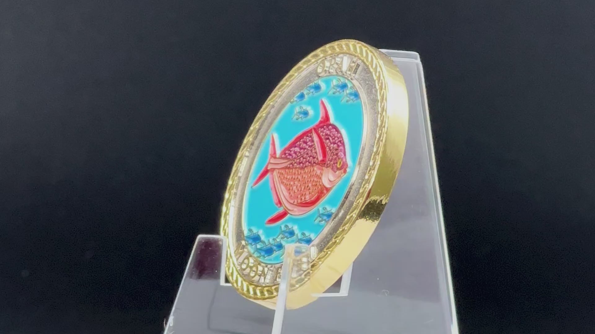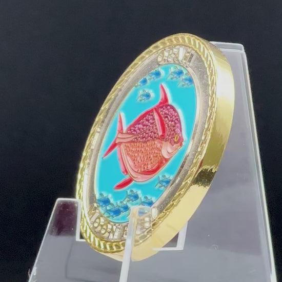 This coin features the Opah or "Moon Fish" as it cruises within a large school of tuna. These fish are seldom caught on rod and reel and are a true lottery ticket fish.